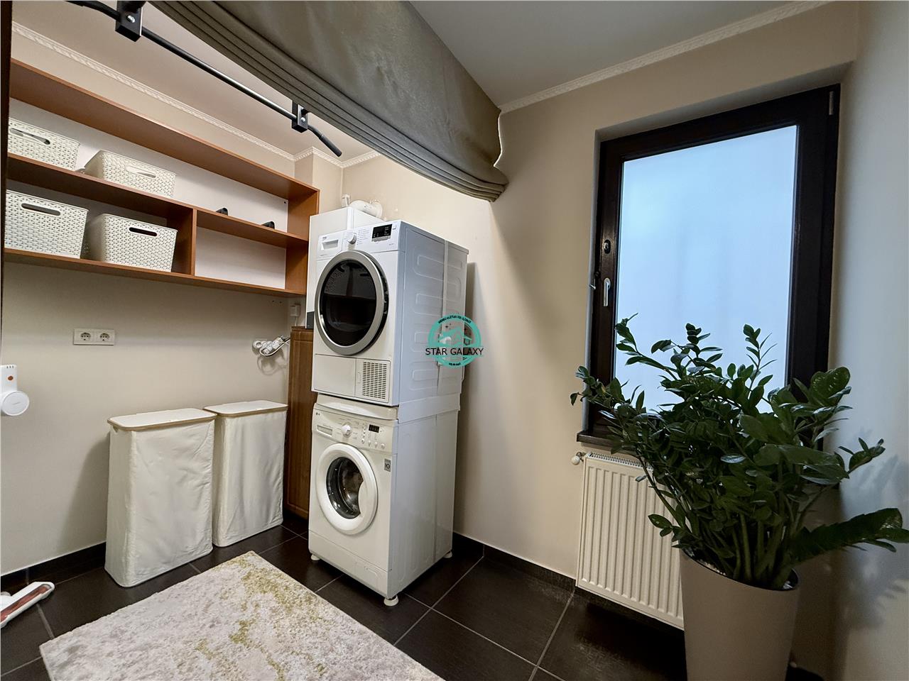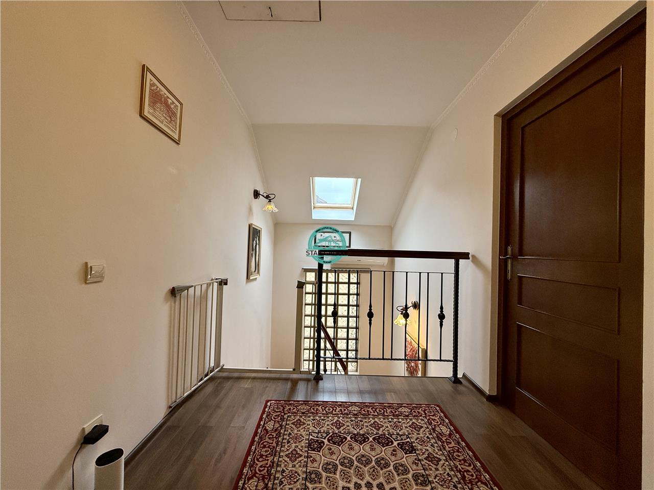 Casa dispune de toate utilitatile si multiple dotari: centrala termica proprie, panouri fotovoltaice de 6 kW, aer conditionat, geamuri termopan, finisaje moderne (gresie, faianta, parchet), poarta automata si sistem de supraveghere video. Curtea este complet amenajata, cu gazon si sistem de irigare, gard din tuia pentru intimitate si spatiu de parcare pentru doua masini.